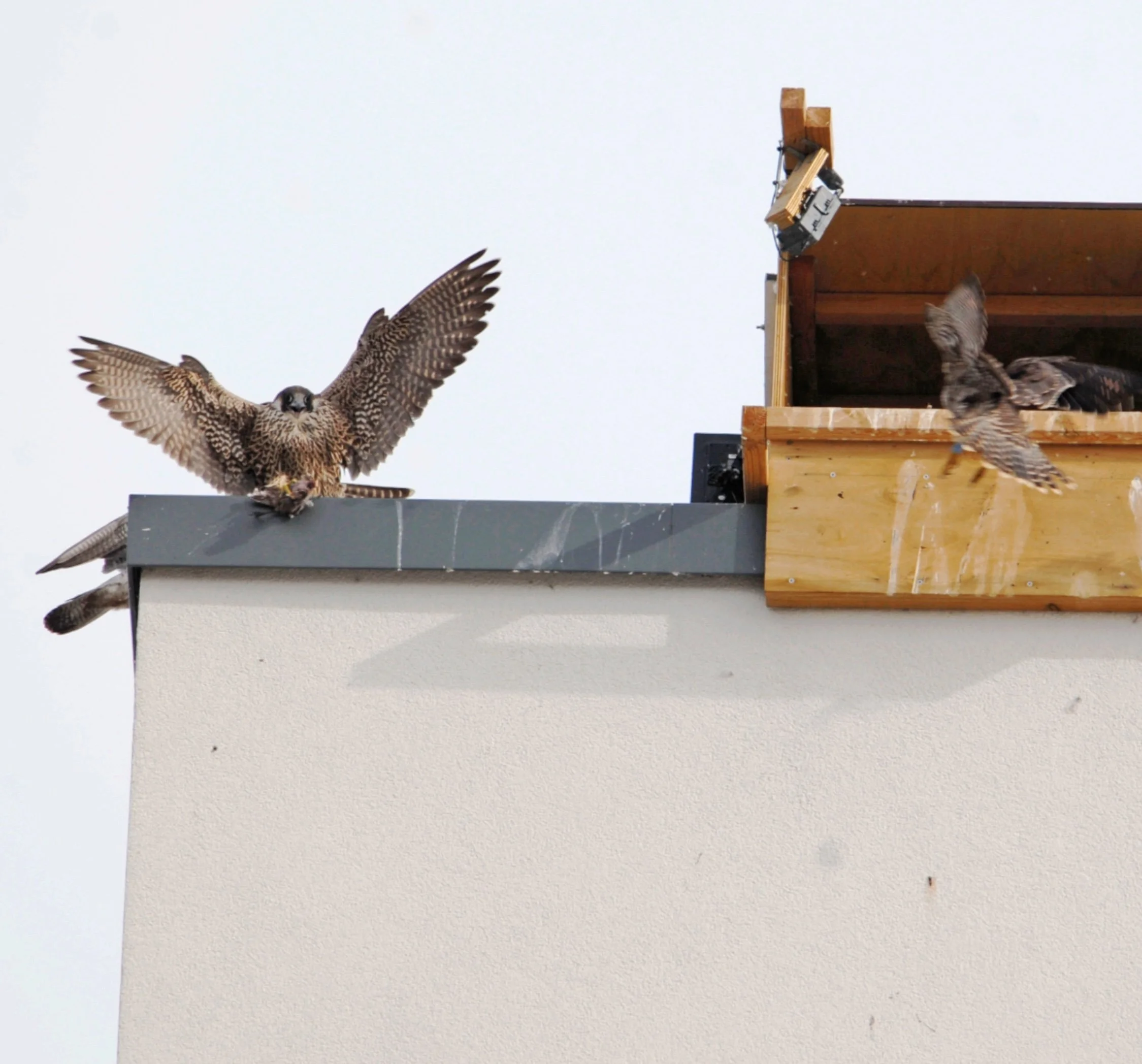 Peregrines love big cliffs with great views. And at 8 floors high, the Barclays building was perfect, tall enough to enable the Peregrines a 360 vista of the harbour, town and beyond. The adult birds would often be spotted on the 8th floor balcony, feeding on freshly caught prey, or simply peering down on the George Roundabout. Meanwhile, the abundant pigeons close by seemed oblivious to what lurked up above!