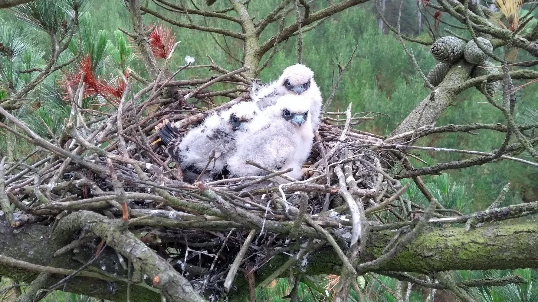 Two young Hobby chicks in a crow nest at the very tip of a pine tree